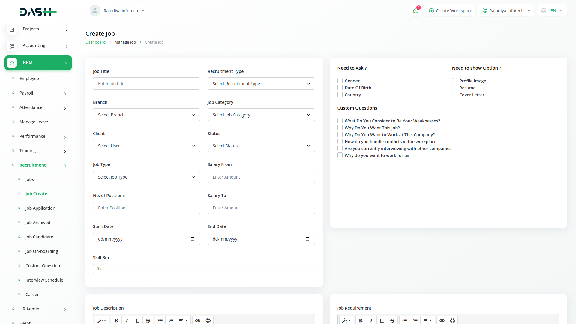 Within the recruitment module, the Jobs Creation page offers a streamlined process for creating new job listings. Users can input essential details including job titles, descriptions, requirements, and any other pertinent information. This intuitive interface allows for the customization of each listing to attract the right candidates. By simplifying the task of posting job openings, users can quickly reach potential candidates while maintaining consistency and professionalism in their job postings.