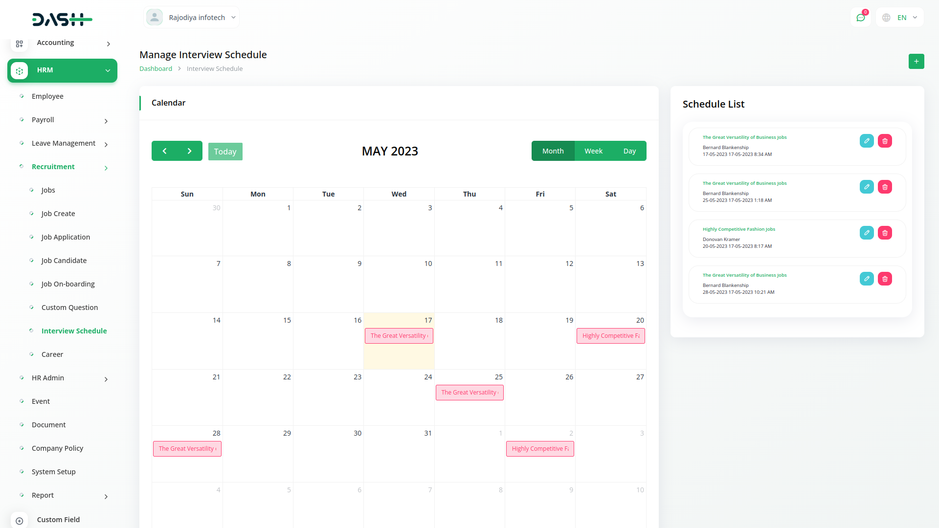 The Dashboard of Recruitment module provides users with an immediate overview of their recruitment activities. It presents key metrics such as the total number of jobs published, expired listings, and the current count of job candidates. Additionally, users can easily view their interview schedule through an interactive calendar and stay updated on recently created job listings and job applications by date. This real-time monitoring tool empowers users to make informed decisions and effortlessly stay on top of their hiring processes.